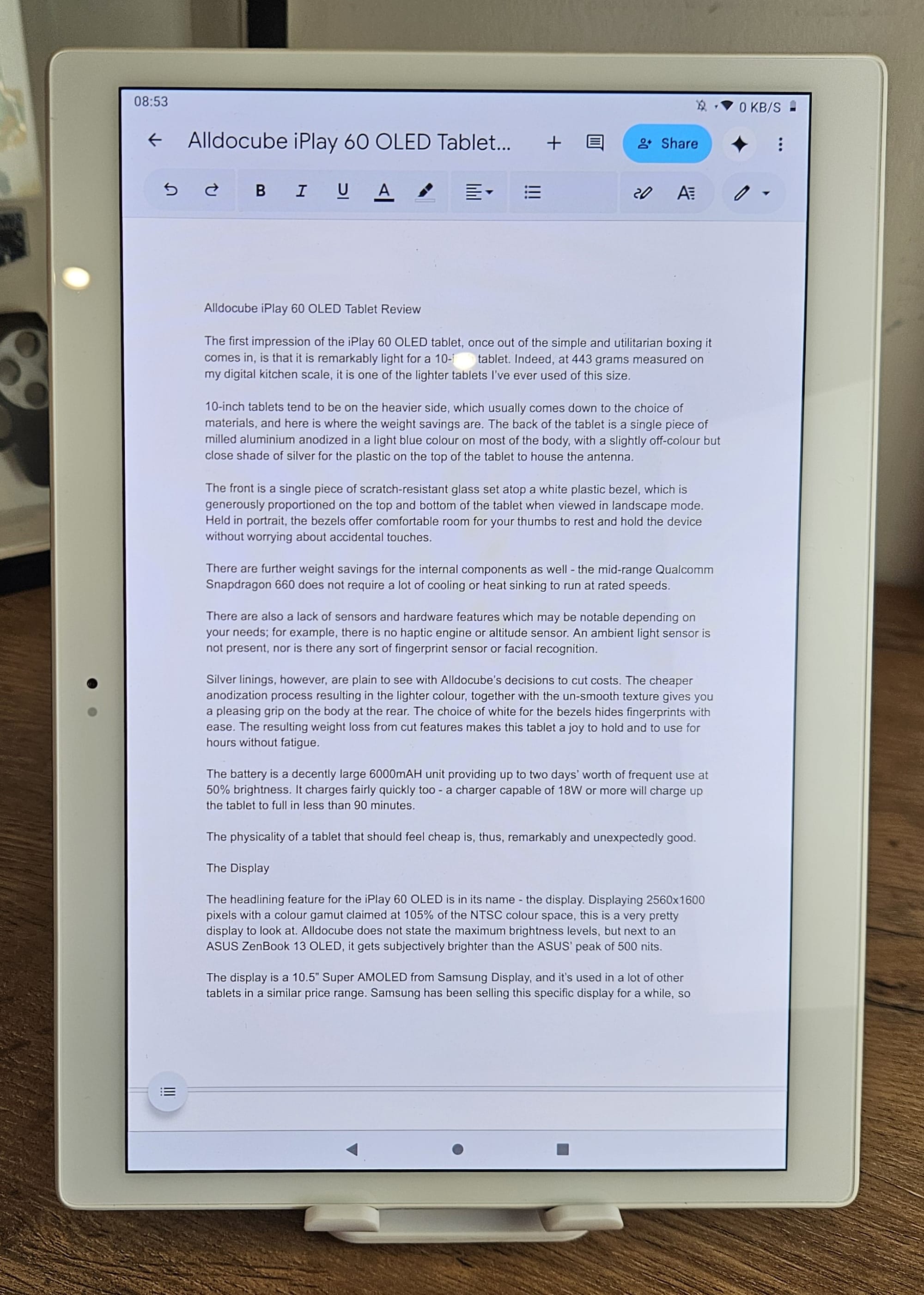 The first impression one gets of the iPlay 60 OLED, once out of the simple and utilitarian packaging it comes in, is that it is remarkably light for a 10.5-inch tablet. Indeed, at 443 grams measured on my digital kitchen scale, it is one of the lightest tablets I’ve ever used of this size.